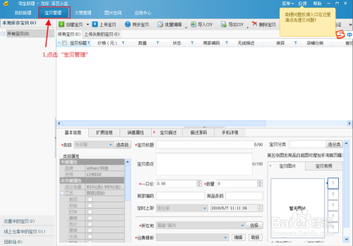 打开淘宝助理工具,登陆店铺后,点击到“宝贝管理”界面。