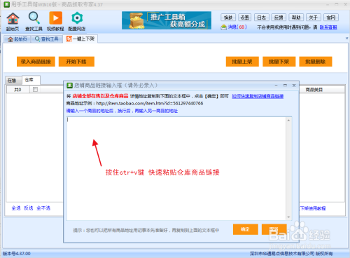 复制好链接后,将该链接复制到【一键上下架】工具的店铺仓库商品链接输入框中,如下图: