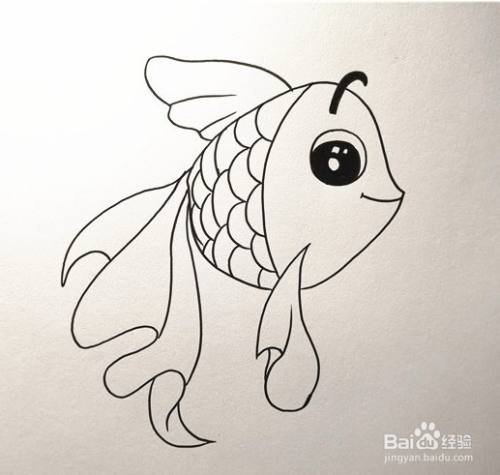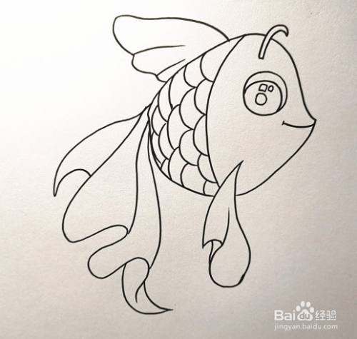 画好以后,还需要把小金鱼身上的鱼鳞画出来,注意鱼鳞的穿插。