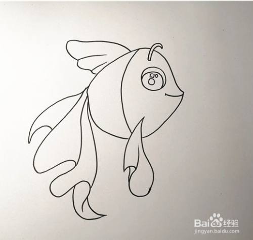 顺着头部画出小金鱼的尾巴和鱼鳍,尾巴的摆度大一些,注意穿插。