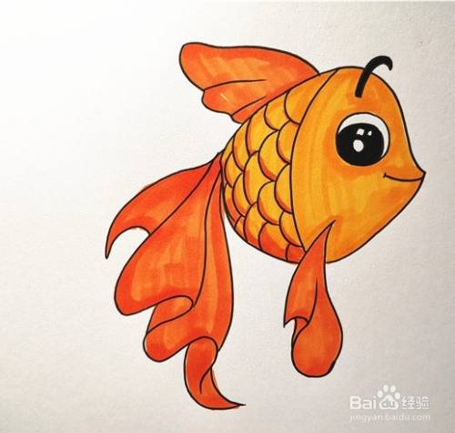 用橘黄色涂小金鱼的身体和头部,暗面的颜色深一些。使用橘黄色涂小金鱼的尾巴和鱼鳍,还有鱼鳞的暗面,这样一幅小金鱼简笔画就完成啦。