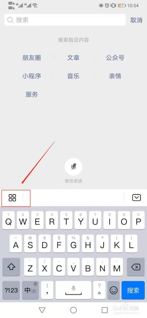 打开微信,点击对话框或搜索框,点击输入框左上角位置