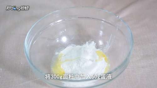 2和面:将300g面粉中加入50g蛋液,200ml水,搅拌均匀,揉成面团。