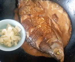 转小火焖煮至锅内鱼汤剩一半时,将鳊鱼小心翻个面,再放入一勺猪油