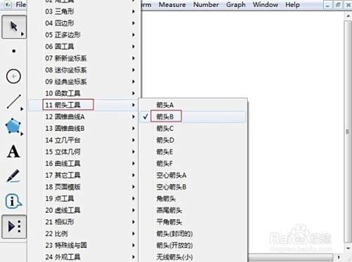步骤一 打开几何画板,鼠标点击左侧工具箱“自定义工具”按钮,在弹出的快捷选项选择“箭头工具”——“箭头B”,如下图所示。
