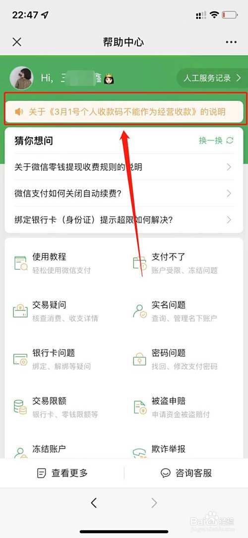 进入帮助中心后可以看到关于3月1日后个人收款码不能作为经营收款的说明,点击查看。