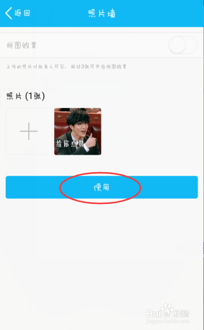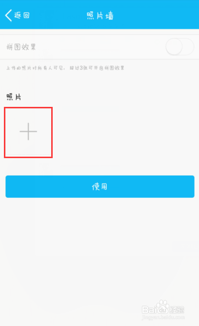 接下来,依次点击“自定义”--“照片墙”--“+”--在“手机照片或者空间相册”选择一张自己喜欢的图片,再点击“使用”等待图片加载出来就设置成功了。设置好的效果图如下: