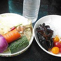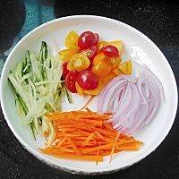 黄瓜、洋葱、胡萝卜切成丝;圣女果切半