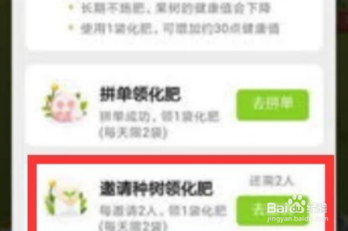 其实在查看健康值的时候,新弹出来的界面下面,还有一份邀请种树领化肥的选项,此时我们还可以通过邀请好友来获得化肥。