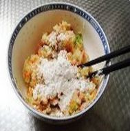 把胡萝卜、香芹和香肠粒放入土豆搅拌均匀