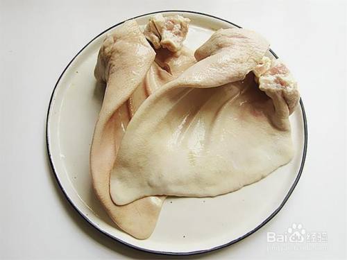 先将猪耳朵用热水洗净后,再将猪毛刮干净。