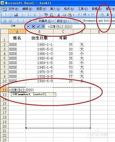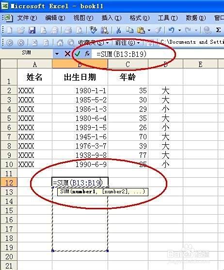 如果要将单元格B13至B19的数据之和填入单元格B6中,操作如下:先选定单元格B13,输入“=”, 再双击常用工具栏中的求和符号“∑”;接着用鼠标单击单元格B13并一直拖曳至B19,选中整个B13~B19区域,这时在编辑栏和B6中可以看到公“=sum(B13:B19)”,单击编辑栏中的“√”(或按Enter键)确认。