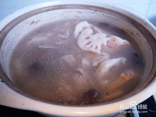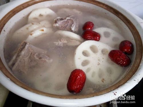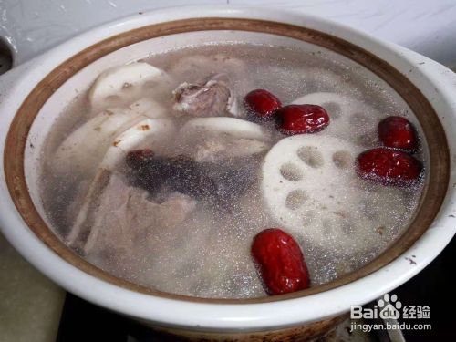 一个小时后,莲藕和扇骨逐渐变烂,红枣和桂圆变得非常饱满,汤也变得甜甜的,骨头中的油也逐渐溢出,放些盐,再煲一会儿,熄火,焖半个小时。