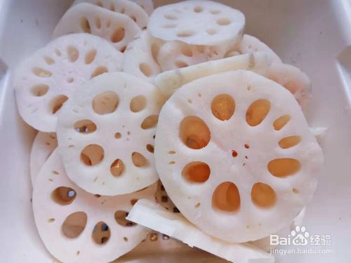 莲藕750克,去掉两边的黑头,用刀刮去外层的一层皮,用刀切成一片一片的,厚度约0.3公分左右。