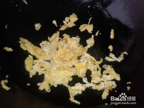 将鸡蛋打散后,锅中倒入适量植物油,将鸡蛋煎熟后备用。