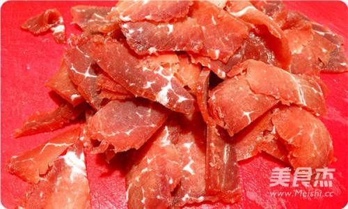 2牛肉横纹切成薄片。