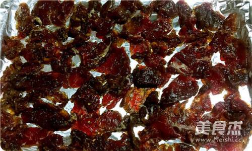 9用一根筷子插在烤箱边缘,使得烤箱可以半开门,230℃烘烤40分钟左右,牛肉水分烘干,即可!