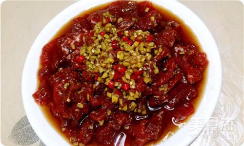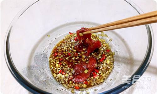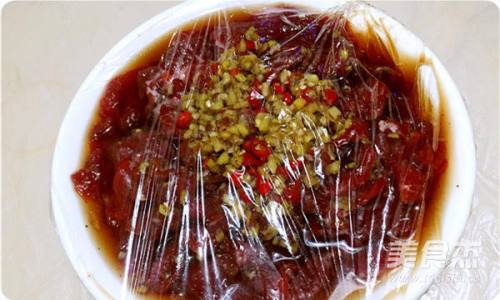 5将牛肉片一片片均匀蘸上调料。