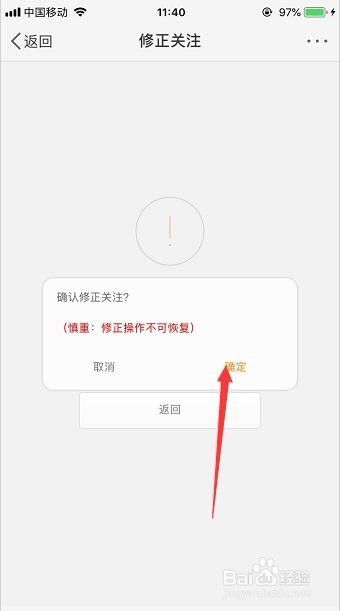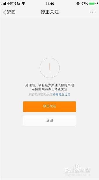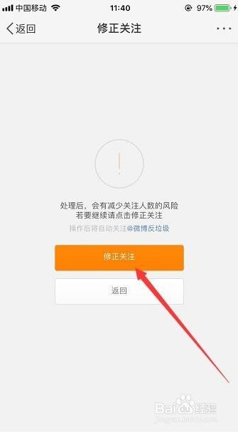 点击打开修正关注页面,微博反垃圾点击页面中间的 修正关注,如下图