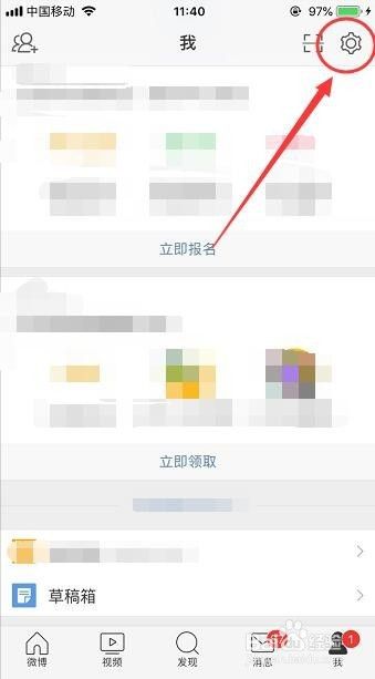 首先打开手机微博,打开我的页面之后的点开右上角的 设置,如下图