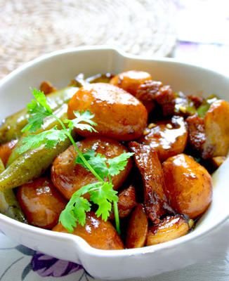 (2)锅置火上,下入牛肉,酱油炒之,加入葱、姜、酱油,并加入水浸过肉块,盖上锅盖,用文火炖至肉快烂时,加入精盐、马铃薯放入再炖,炖至肉、马铃薯酥烂而入味时即成。