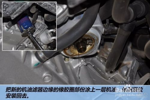 ⑤把新的机油滤器边缘的橡胶圈部份涂上一层机油,依照原位安装回去。之后将放油螺丝拧上,不要太用力,防止螺纹溢扣。