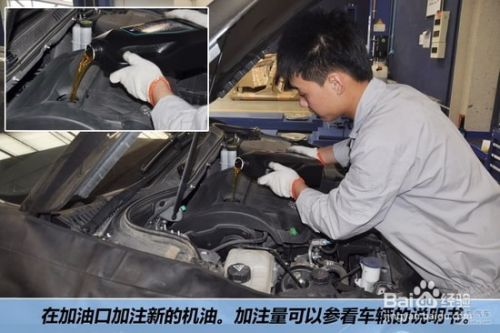 ⑥在加油口加注新的机油。加注量可以参看车辆的说明书。