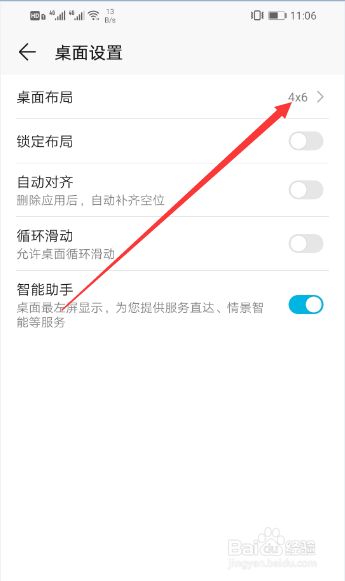 第4步进入到桌面设置后,在桌面设置中可以找到桌面布局,这里桌面布局默认的是4×6的,我们可以将其更改。