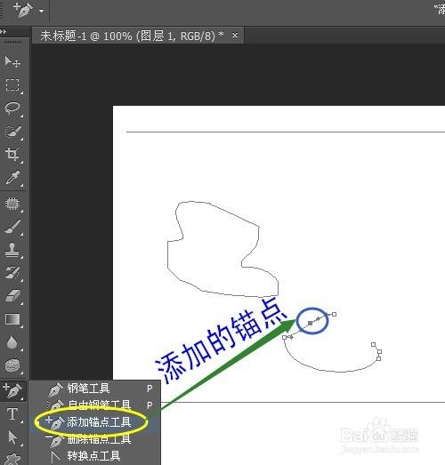 添加锚点工具,在已画出的路径上单击增加点,以方便调整路径。如图: