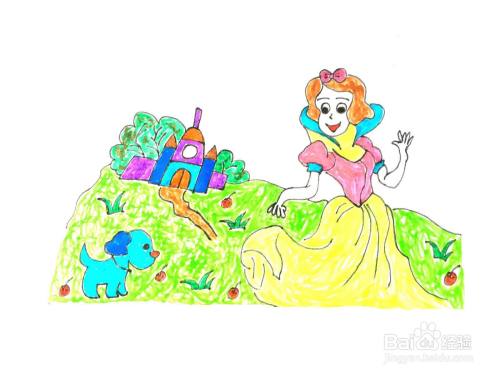 最后将这幅在城堡跳舞的公主场景画涂上喜欢的水彩颜色就可以了,如图所示,在城堡跳舞的公主水彩画就画完了。