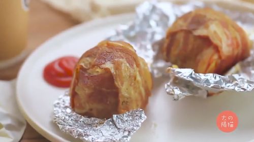 6用培根包裹好土豆泥,卷紧,再用锡纸全部包裹好。