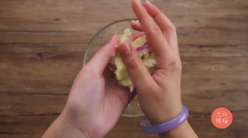 3取出一块混合好的土豆泥,压扁。