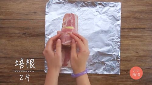 5在锡纸上铺上2片培根。