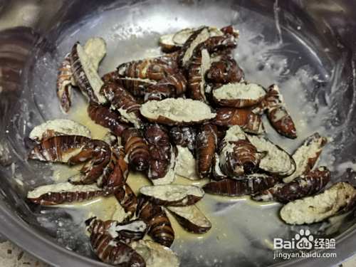 蝉蛹加入料酒酱油蚝油糖盐五香粉及淀粉抓匀颜值10分钟。