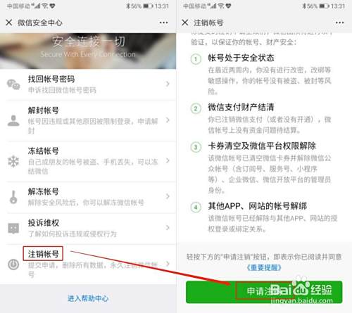 进入“微信安全中心”后,点击【注销账号】,假装要注销账号,但是微信里有钱或绑定了其它账号等情况存在是无法注销微信的。接着点击【申请注销】按钮。