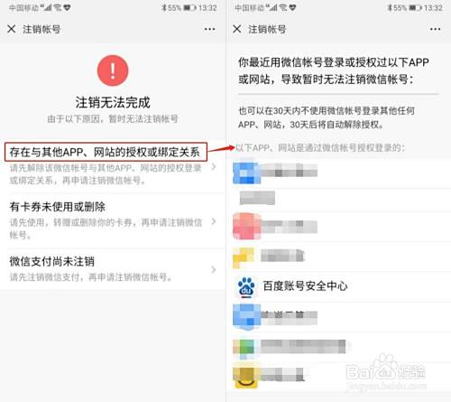 然后就会出现“注销无法完成”的提示,点击【存在与其他APP、网站的授权或绑定关系】,这样就可以看到使用微信登录的APP、网站了。但是在这里是不能直接解绑的。但是只要在30天内不使用这些应用的话就会自动解绑。
