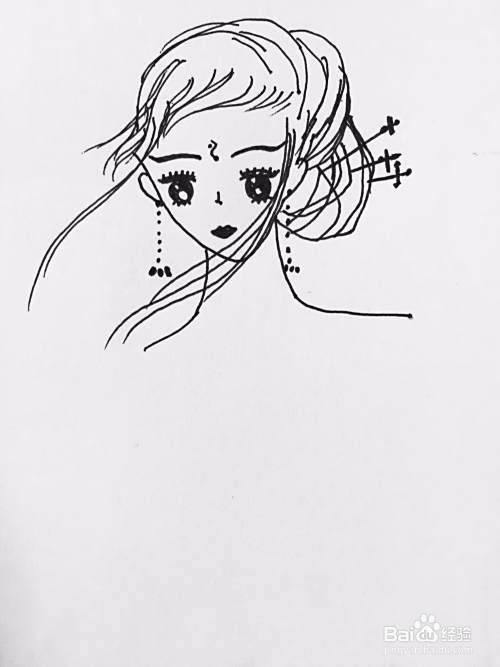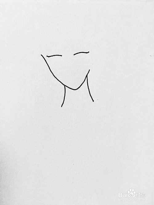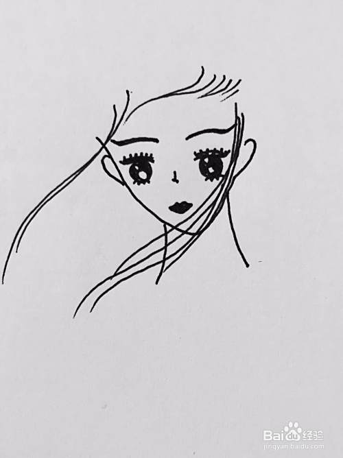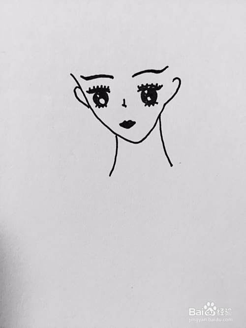 首先是画头部,头部分两笔勾勒,形状呈花朵花瓣型。观察饱满的花瓣样式,照着下图练习。用笔要适力,不可执笔过度,产生抖动歪斜就不好了。线条柔和的瓜子脸型显得人物形象年轻富活力。依次画好耳朵、眉毛和双眼皮,具体参考请看图。