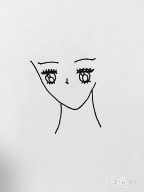 不同眼型诠释的人物个性不同。例如娘子眼睛的形状选择圆形,这样的眼睛十分迷人。画法是在双眼皮正下方画上两个圆圈,作为瞳孔。两圆圈的大小位置分布为:小圆圈在眼睛的左上方,大圆圈在眼睛的右下角。眼睛里除两个圆圈,其他部分用黑色碳素笔填色。画好卡通女娘子的眼睛,我们在双眼皮和下眼球正中位置各加上睫毛。接着画鼻子和嘴巴。具体请参见下图。