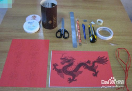 首先准备带图案的硬纸(或挂历纸)2张(A4)、硬纸(或售楼处宣传彩页)1张(A4)、婴儿扑粉盒盖2个、剪刀、刻度尺、吸管(珍珠奶茶)、笔 、壁纸刀、透明胶布、双面胶、细红绳、一元硬币1枚。