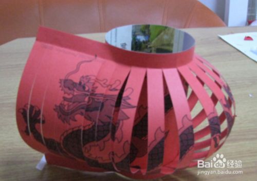 展开纸条,把纸条左右两边粘在一起围成灯笼的形状,最后给灯笼加一个一个提手吧,我们选择了金色的塑料条。