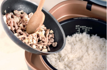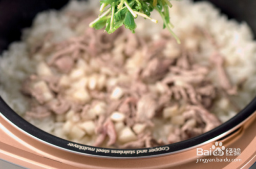 当饭煮至15分钟左右,将马蹄和肉快速铺入电饭煲,合盖