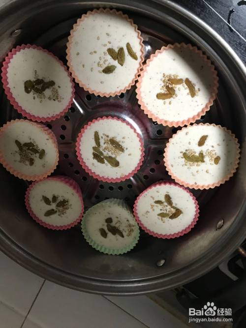 现在可以把葡萄干洗干净,沥干水分待用。把发酵好的面糊倒入模具杯中,然后摆放在蒸锅里,每个杯中撒上几粒葡萄干,再撒点熟芝麻(黑白芝麻都可以),盖好盖子,用抹布延盖子口压紧使之密封更好。