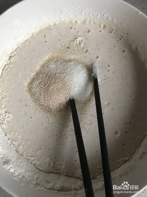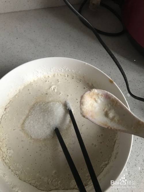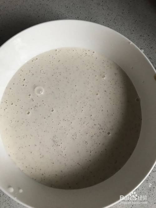 把迷糊倒入大碗中,加入100毫升纯牛奶、30克左右的面粉、30克白砂糖、3克酵母粉,搅拌均匀。