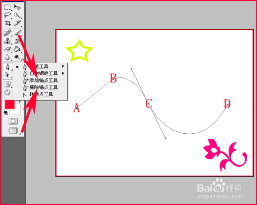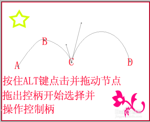控制炳改变路径:按住Alt键点击一下节点,节点变成实心的,在用鼠标点住节点拖出两条控制柄,这时就可以调节两条控制柄方向长短来调节曲线。注意Alt键要一直按住。
