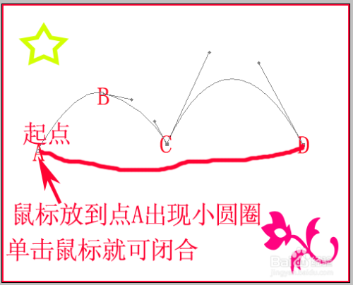 闭合路径:画好路径闭合时,将鼠标指向起始点,这时鼠标变成鼠标下方出现一个小圆圈,单击一下就可使路径闭合。