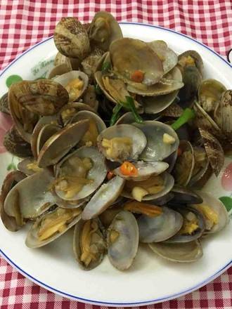 油热,姜丝蒜末下锅爆香。倒入花蛤翻炒,加入少量料酒调香,继续翻炒,至花蛤开口,撒入葱断和辣椒断,倒入一勺生抽。翻炒均匀后出锅。