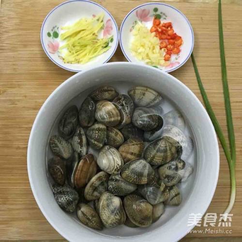 花蛤洗净,浸入水中,放一勺盐吐沙。姜切丝,蒜切末,葱和辣椒切断。