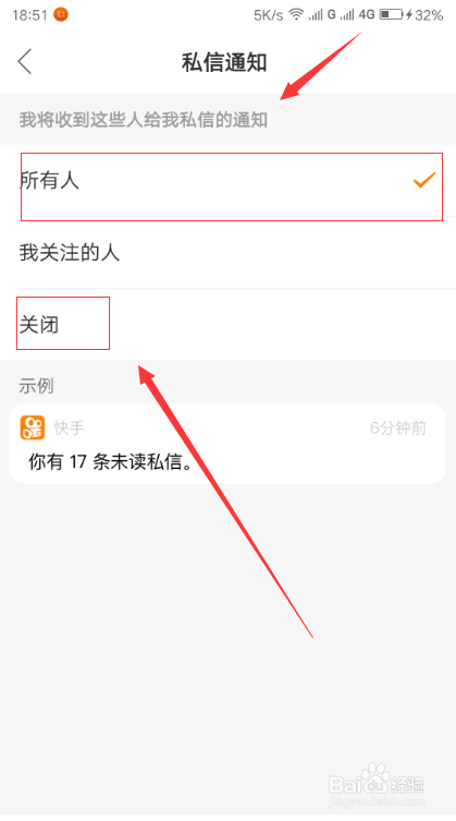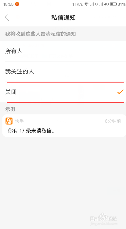 在私信通知页面,我们可以对私信通知进行设置了。我们可以设置接收所有人的私信,也可以设置只接收关注我的人的私信,也可以把私信通知给关闭了,关闭之后,所有人的私信都不会被我们所接收。