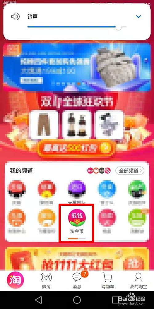 打开APP界面,APP停留在淘的界面。在中间的图标中找到“淘金币”的图标,点击进入“金币庄园”