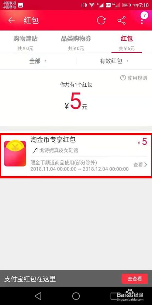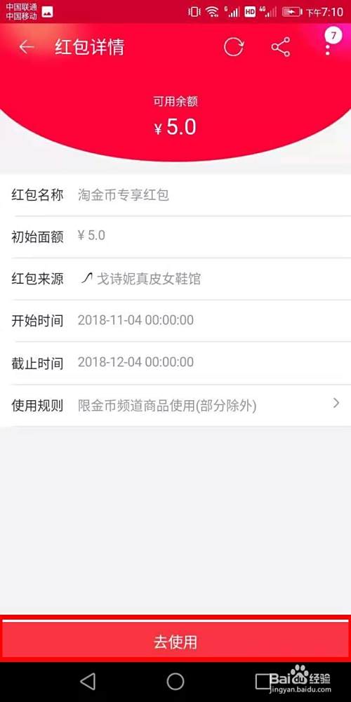 点开红包后,你可以看到使用该红包的限制条件,并且点击下面的去使用便可以到相应的页面使用该红包。